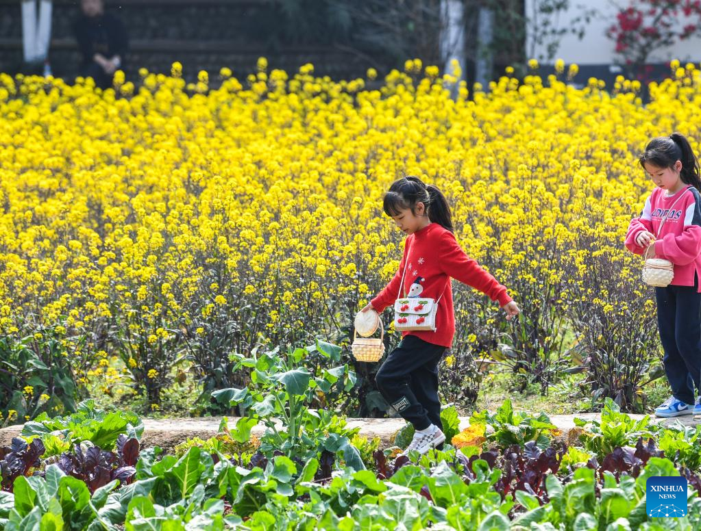 A young tourist looks at flowers in a cole flower field in Daoming Town of Chongzhou, southwest China's Sichuan Province, March 5, 2023. (Xinhua/Wang Xi)