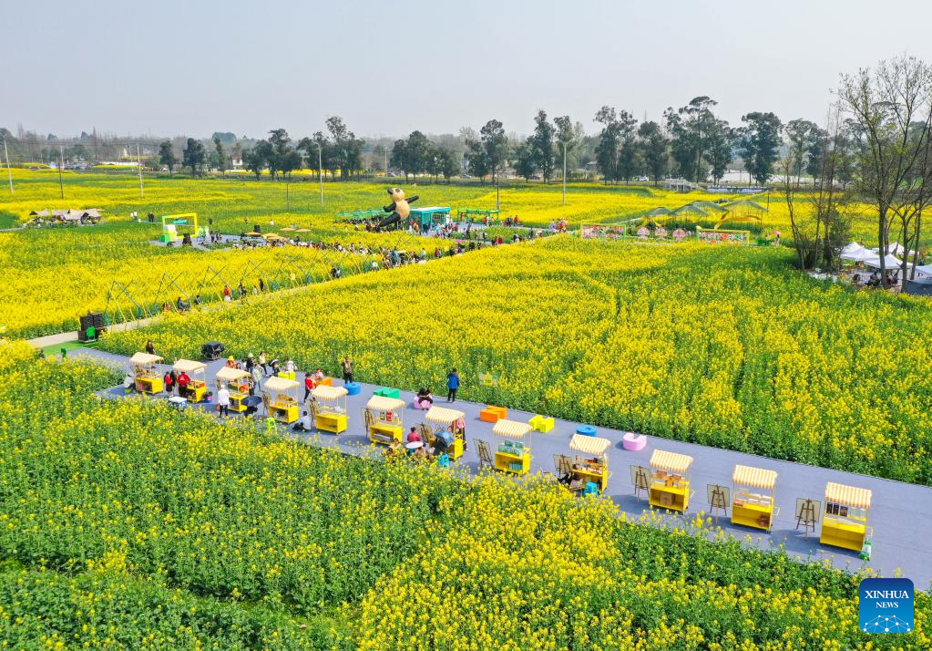 This aerial photo taken on March 5, 2023 shows tourists visiting a cole flower field in Daoming Town of Chongzhou, southwest China's Sichuan Province. (Xinhua/Wang Xi)