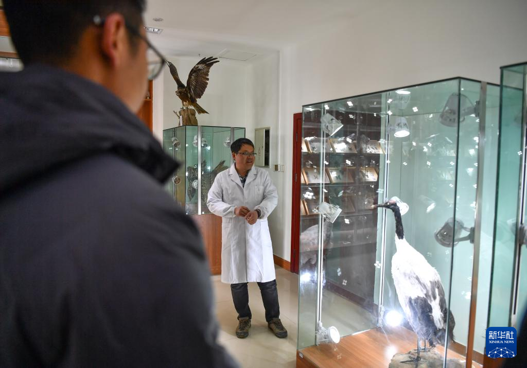 Yang Le (R) introduces the behavior of black-necked cranes in the Tibet Plateau Institute of Biology in Lhasa, southwest China's Tibet Autonomous Region, March 2, 2023. (Xinhua/Jigme Dorje)