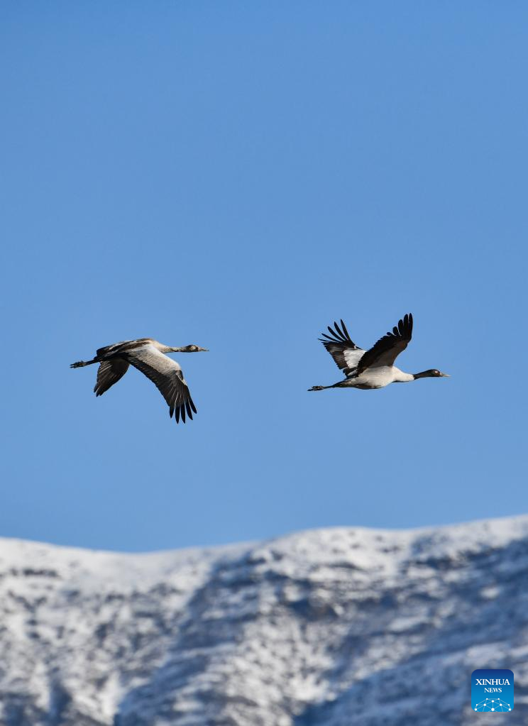 This photo taken on March 1, 2023 shows black-necked cranes in Lhunzhub County of Lhasa, southwest China's Tibet Autonomous Region. (Xinhua/Zhang Rufeng)