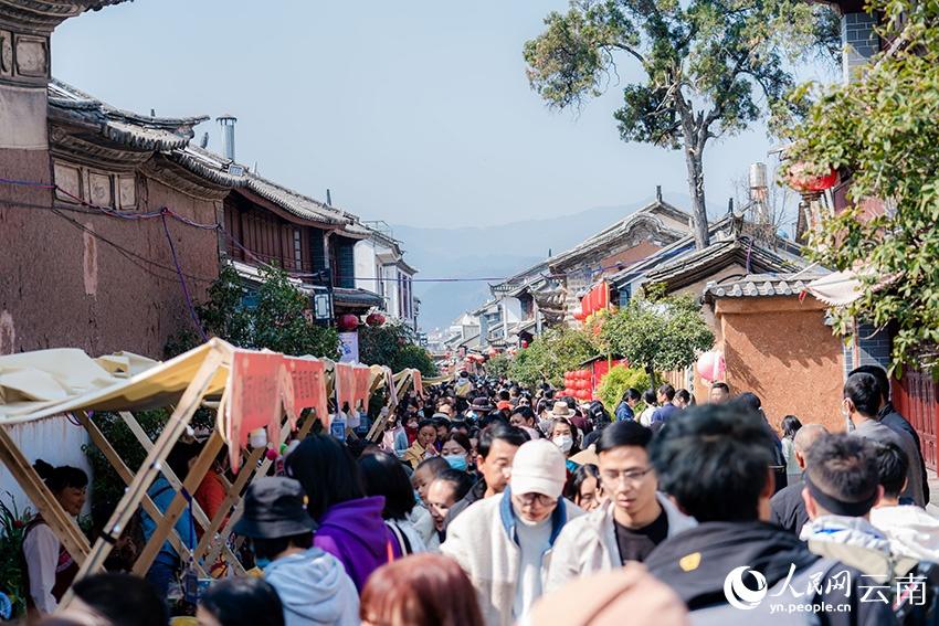 A street is jammed with visitors during a street food carnival in Weishan ancient town in Dali Bai Autonomous Prefecture, southwest China’s Yunnan Province. (Photo/Liu Xukai)