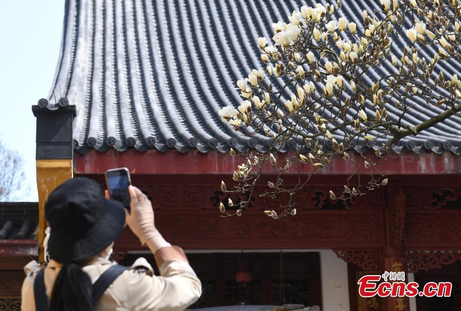 A tourist takes photos of a 500-year-old ancient magnolia tree at Faxi Temple in Hangzhou, east China's Zhejiang Province, March 6, 2023. (Photo: China News Service/Xu Ziqi)