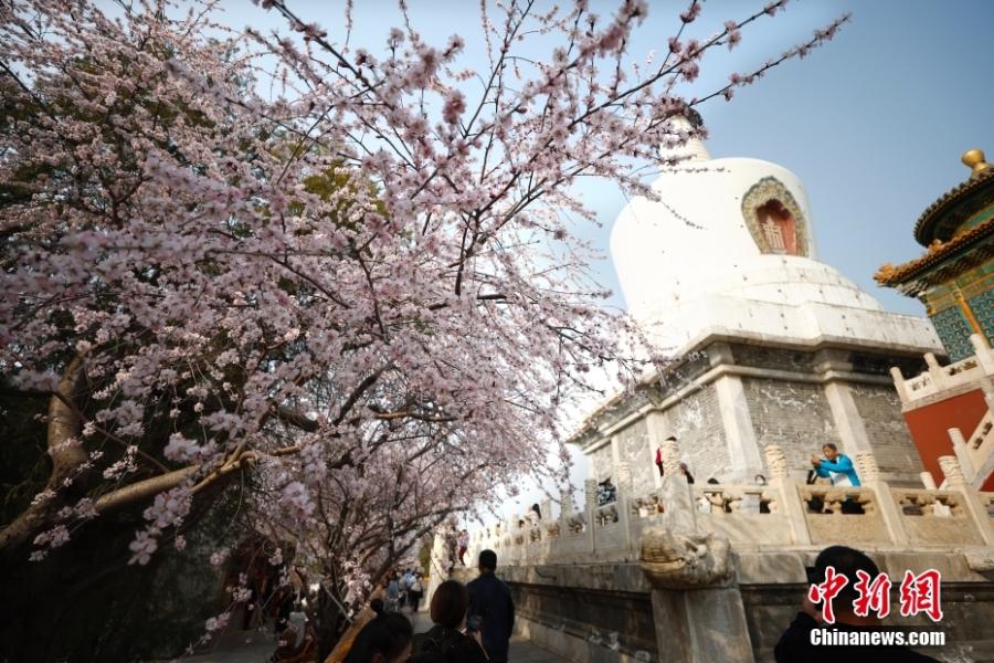 Peach blossoms next to the White Pagoda at Beihai Park are in full bloom, attracting many tourists in Beijing, March 8, 2023. (Photo: China News Service/Fu Tian)