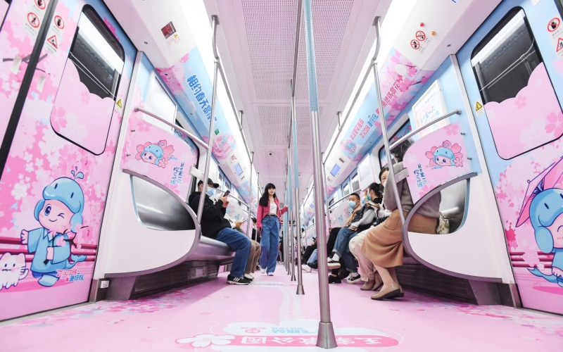 Passengers take a cherry blossom-themed metro train in Wuhan, central China’s Hubei Province. (Photo courtesy of Wuhan Metro)