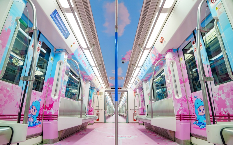 Photo shows the interior of a cherry blossom-themed metro train in Wuhan, central China’s Hubei Province. (Photo courtesy of Wuhan Metro)