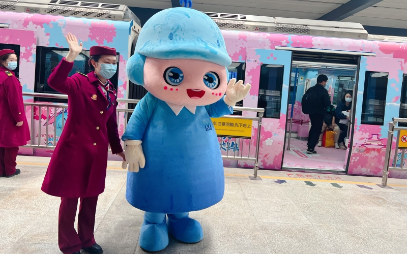 Photo shows a finless porpoise mascot of Wuhan Metro at a metro station in Wuhan, central China’s Hubei Province. (Photo courtesy of Wuhan Metro)