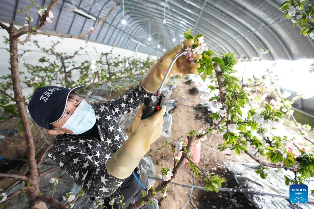 A staff member pollinates a cherry tree at a greenhouse in Jiamusi, northeast China's Heilongjiang Province, March 9, 2023. In Heilongjiang Province, though the temperature is still low in early spring, villagers are taking advantage of greenhouses to boost agricultural production efficiency and increase their income. (Xinhua/Wang Jianwei)