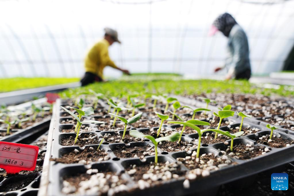 Villagers work at a greenhouse in Xingsheng Village of Ning'an Town, Ning'an City, Mudanjiang, northeast China's Heilongjiang Province, March 10, 2023. In Heilongjiang Province, though the temperature is still low in early spring, villagers are taking advantage of greenhouses to boost agricultural production efficiency and increase their income. (Xinhua/Wang Jianwei)