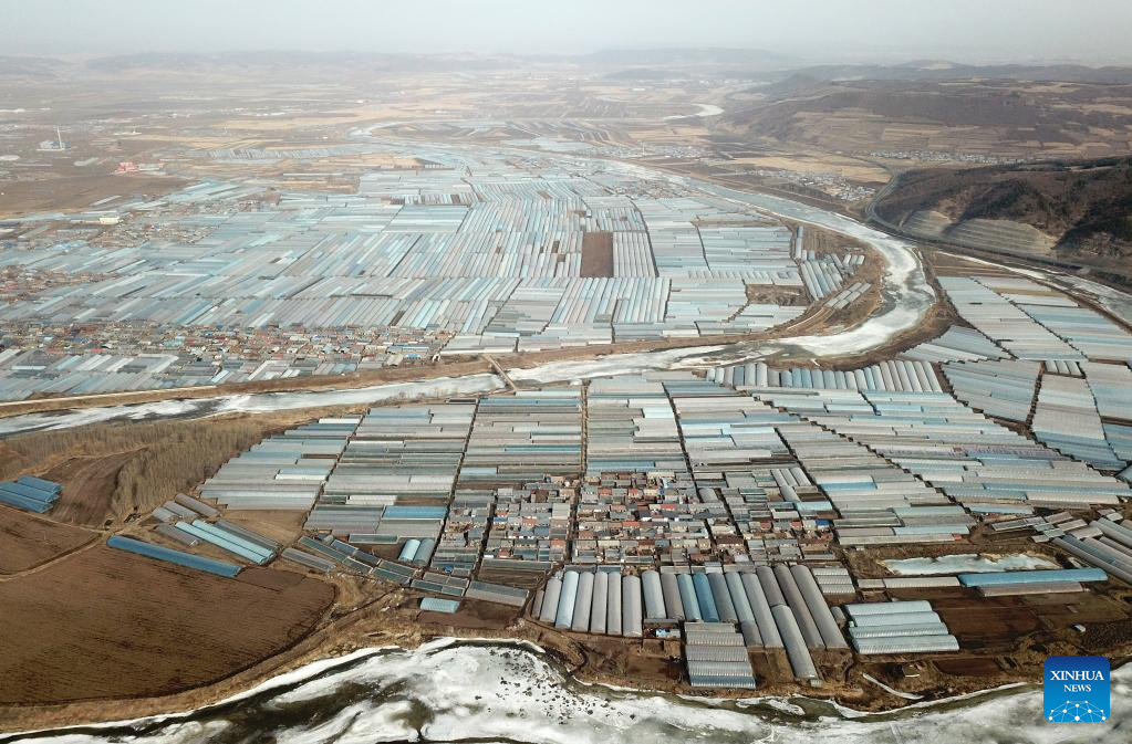 This aerial photo taken on March 9, 2023 shows greenhouses in Jiamusi, northeast China's Heilongjiang Province. In Heilongjiang Province, though the temperature is still low in early spring, villagers are taking advantage of greenhouses to boost agricultural production efficiency and increase their income. (Xinhua/Wang Jianwei)