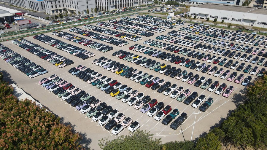 Aerial photo taken on Oct. 12, 2022 shows new energy vehicles (NEVs) at a factory of Chinese automaker Chery Holding Group Co., Ltd. in Wuhu City, east China's Anhui Province. (Xinhua/Zhou Mu)