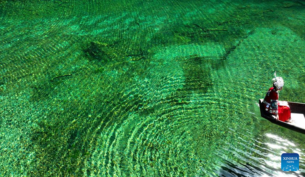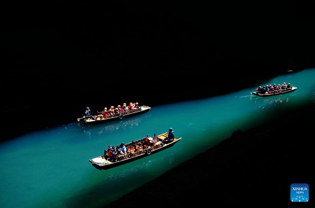 This aerial photo taken on March 14, 2023 shows a boat rides in the Pingshan canyon, a tourist attraction famous for its limpid water, in Hefeng County, Enshi Tujia and Miao Autonomous Prefecture, central China's Hubei Province. (Photo by Yang Shunpi/Xinhua)