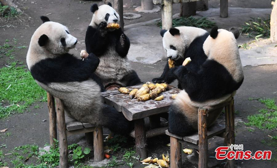 Four giant pandas, Shuang Shuang, Chong Chong, Xi Xi and Qing Qing, enjoy their refreshments, attracting many visitors, at Chongqing Zoo, March 15, 2023. (Photo: China News Service/Zhou Yi)