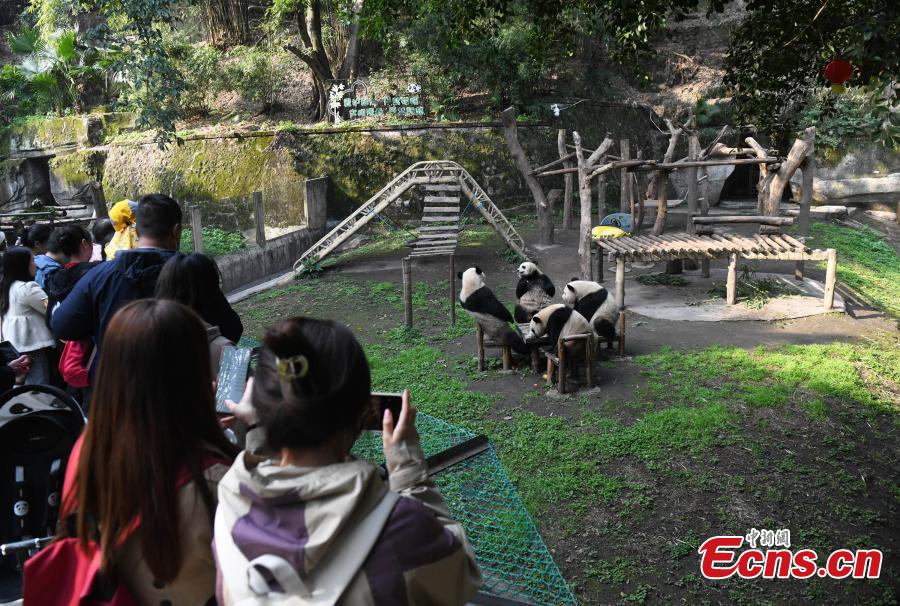 Four giant pandas, Shuang Shuang, Chong Chong, Xi Xi and Qing Qing, enjoy their refreshments, attracting many visitors, at Chongqing Zoo, March 15, 2023. (Photo: China News Service/Zhou Yi)