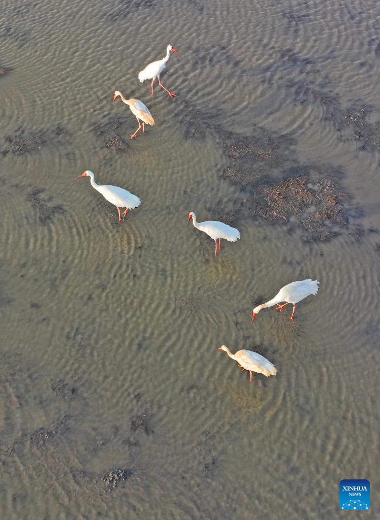 This aerial photo taken on March 15, 2023 shows white cranes at Huanzidong wetland in Faku County, northeast China's Liaoning Province. (Xinhua/Yang Qing)