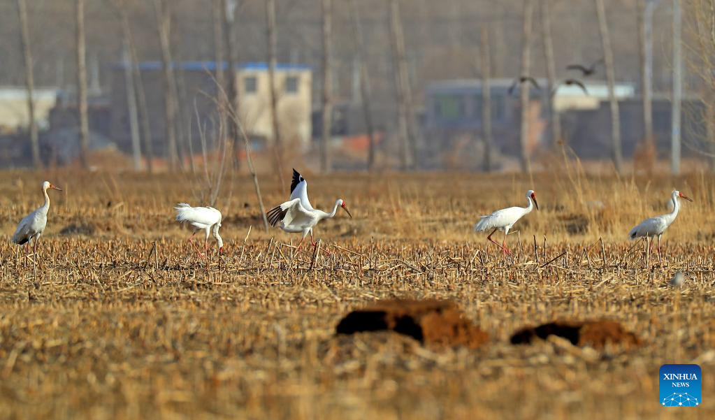 This photo taken on March 15, 2023 shows white cranes at Huanzidong wetland in Faku County, northeast China's Liaoning Province. (Xinhua/Yang Qing)