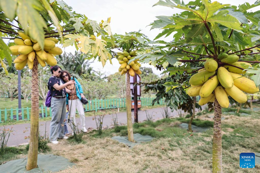 Tourists take photos at a scenic spot featuring tropical fruits in Qionghai, south China's Hainan Province, March 15, 2023. As a key project of a pilot zone for international agricultural cooperation in Hainan Province, the scenic spot has introduced more than 500 kinds of tropical fruits from all over the world, which promotes the integrated development of agriculture and tourism. (Xinhua/Zhang Liyun)