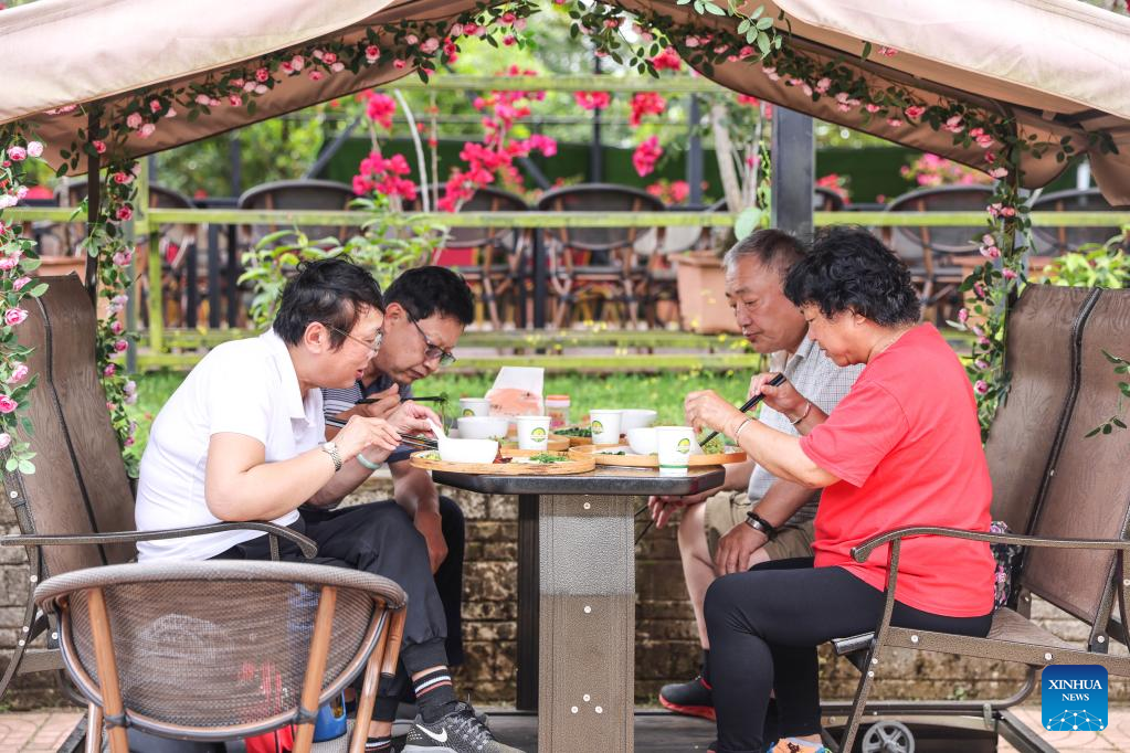 Tourists enjoy food at a scenic spot featuring tropical fruits in Qionghai, south China's Hainan Province, March 15, 2023. As a key project of a pilot zone for international agricultural cooperation in Hainan Province, the scenic spot has introduced more than 500 kinds of tropical fruits from all over the world, which promotes the integrated development of agriculture and tourism. (Xinhua/Zhang Liyun)