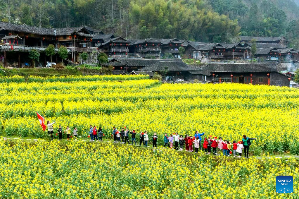 Children walk among cole flower fields in front of Diaojiaolou buildings (houses on stilts) in Xuanen County, central China's Hubei Province, March 18, 2023. (Photo by Chen Xukai/Xinhua)