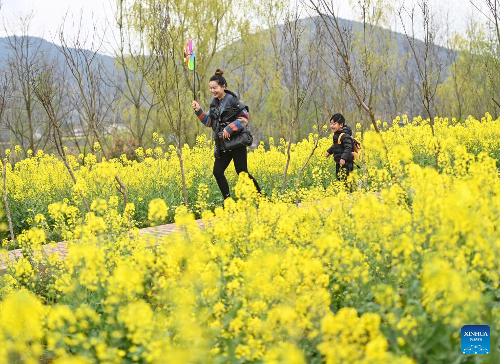 Tourists have fun in cole flower fields in Hanzhong City, northwest China's Shaanxi Province, March 18, 2023. As the temperature gradually rises, the cole flowers in full bloom have attracted many tourists to Hanzhong. In recent years, the rural revitalization of Hanzhong has been greatly promoted by the development of ecological agriculture and tourism. (Photo by Zou Jingyi/Xinhua)