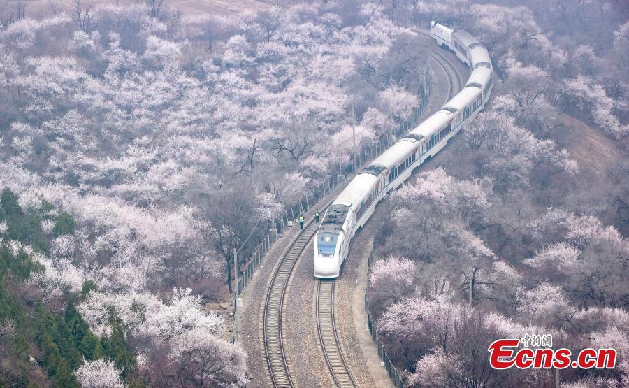 A suburban train runs through blooming flowers interspersed along the S2 line near Juyongguan Pass of the Great Wall in Beijing, March 21, 2023. (Photo: China News Service/Yi Haifei)