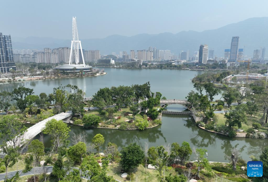 This aerial photo taken on March 22, 2023 shows a view of the artificial Jin'an Lake in Fuzhou, southeast China's Fujian Province. (Xinhua/Lin Shanchuan)