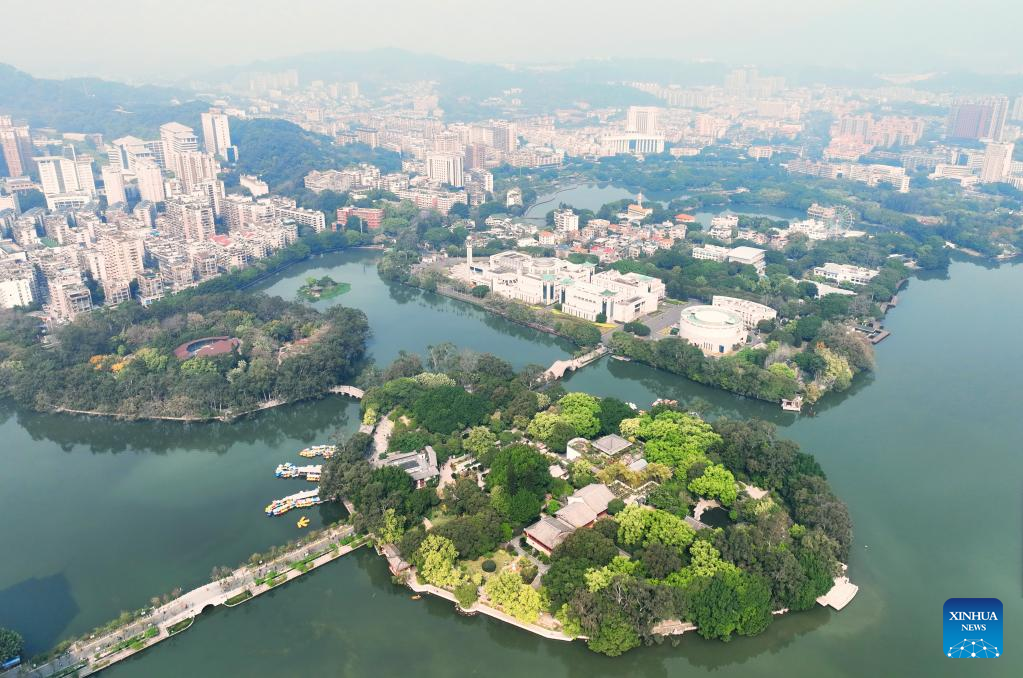 This aerial photo taken on March 22, 2023 shows a view of West Lake Park in Fuzhou, southeast China's Fujian Province. (Xinhua/Lin Shanchuan)