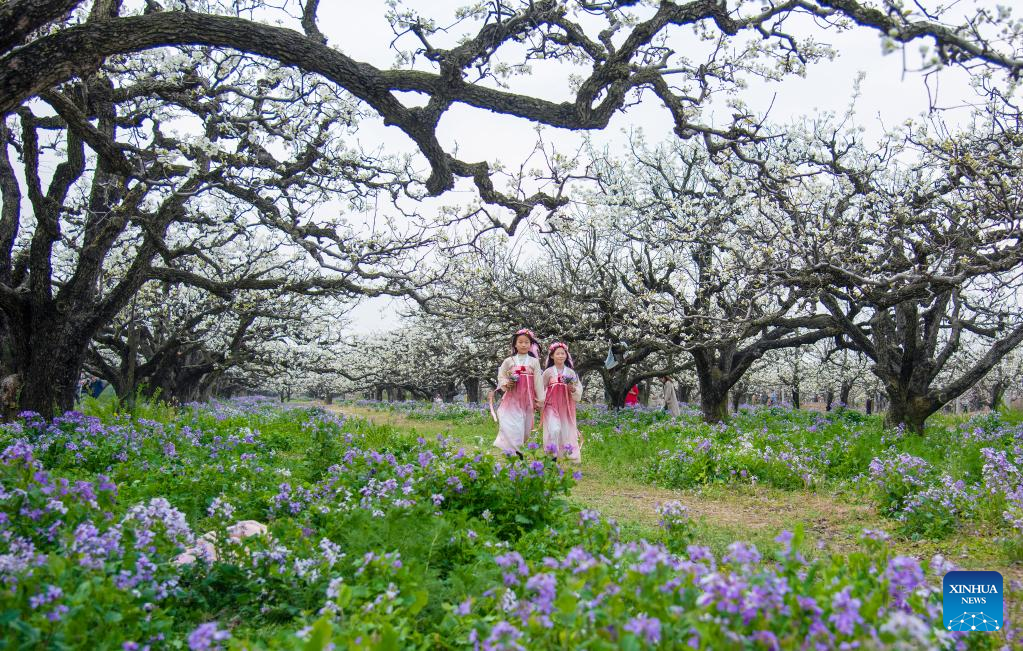 Tourists enjoy flowers at a pear garden in Dangshan County, Suzhou City, east China's Anhui Province, March 25, 2023. Recently, pear trees in Dangshan County of east China's Anhui Province have entered full bloom. Various activities are held in the pear garden to attract tourists. (Photo by Cui Meng/Xinhua)