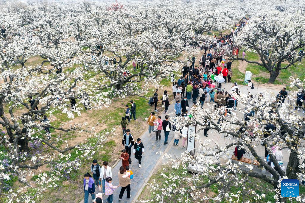 This aerial photo taken on March 26, 2023 shows tourists enjoying pear blossoms at a pear garden in Dangshan County, Suzhou City, east China's Anhui Province. Recently, pear trees in Dangshan County of east China's Anhui Province have entered full bloom. Various activities are held in the pear garden to attract tourists. (Photo by Cui Meng/Xinhua)