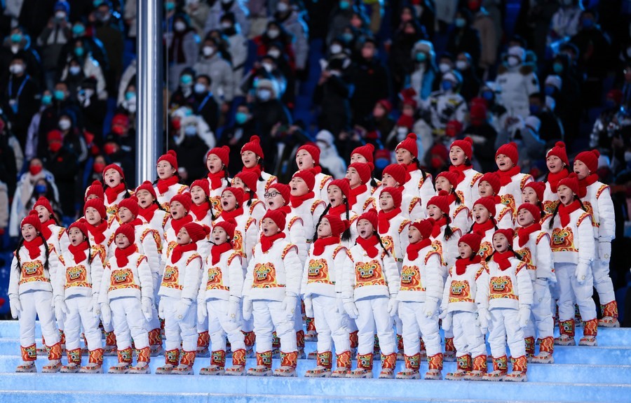 Malanhua Children's Choir sing the Olympic Anthem during the opening ceremony of the Beijing 2022 Olympic Winter Games at the National Stadium in Beijing, Feb. 4, 2022. (Xinhua/Cao Can)