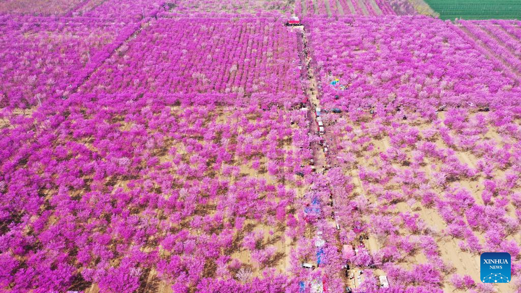 This aerial photo shows the redbud flower fields in Xiaozhao Township of Jian'an District, Xuchang City, central China's Henan Province, March 27, 2023. Recently, about 200 mu (around 13.33 hectares) of redbud trees in Xiaozhao Township entered full bloom, attracting many tourists to enjoy the flowers. (Xinhua/Niu Shupei)