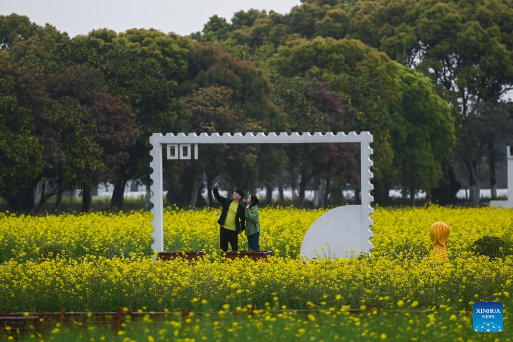 Tourists take a selfie at a farming cultural park in Zhenzhong Village of Jiaxing City, east China's Zhejiang Province, April 3, 2023. In June 2003, Zhejiang Province launched the "Thousand Villages Demonstration and Ten Thousand Villages Renovation" project, with the aim of comprehensively renovating ten thousand administrative villages in the province and building a thousand key villages of them into all-round well-off model villages. For twenty years, the project has created thousands of beautiful villages, and fundamentally changed the face of the province's countryside. (Xinhua/Xu Yu)