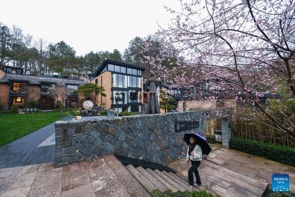 A tourist walks near a homestay in Qianyuan Village of Jiande City, east China's Zhejiang Province, Feb. 28, 2023. In June 2003, Zhejiang Province launched the "Thousand Villages Demonstration and Ten Thousand Villages Renovation" project, with the aim of comprehensively renovating ten thousand administrative villages in the province and building a thousand key villages of them into all-round well-off model villages. For twenty years, the project has created thousands of beautiful villages, and fundamentally changed the face of the province's countryside. (Xinhua/Xu Yu)