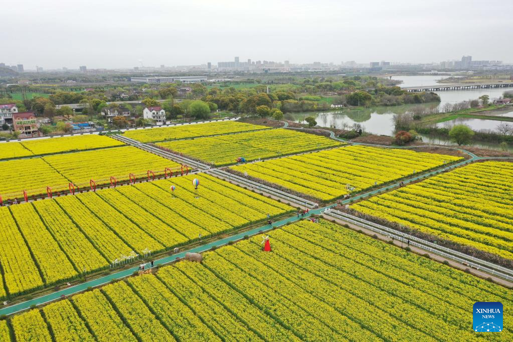 This aerial photo taken on March 25, 2023 shows tourists enjoying themselves in a canola flower field at an eco-tourism scenic spot in Balidian Town of Huzhou City, east China's Zhejiang Province. In June 2003, Zhejiang Province launched the "Thousand Villages Demonstration and Ten Thousand Villages Renovation" project, with the aim of comprehensively renovating ten thousand administrative villages in the province and building a thousand key villages of them into all-round well-off model villages. For twenty years, the project has created thousands of beautiful villages, and fundamentally changed the face of the province's countryside. (Xinhua/Huang Zongzhi)