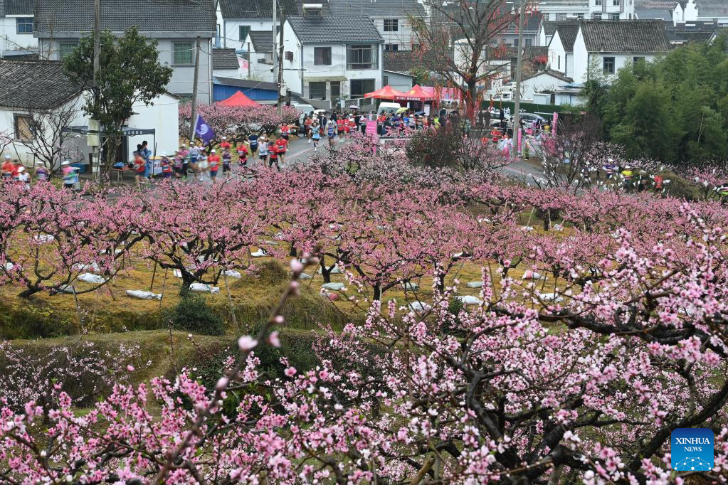 Marathon runners run past a peach orchard in Linjia Village of Ningbo City, east China's Zhejiang Province, March 19, 2023. In June 2003, Zhejiang Province launched the "Thousand Villages Demonstration and Ten Thousand Villages Renovation" project, with the aim of comprehensively renovating ten thousand administrative villages in the province and building a thousand key villages of them into all-round well-off model villages. For twenty years, the project has created thousands of beautiful villages, and fundamentally changed the face of the province's countryside. (Xinhua/Huang Zongzhi)