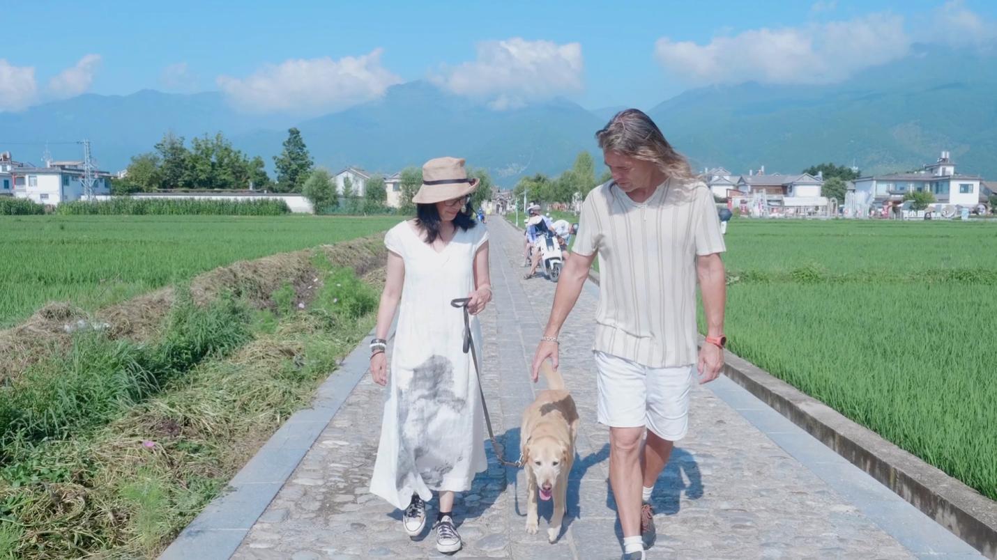 Brian Linden and his wife Jeanee walk amidst paddy fields in Xizhou, southwest China's Yunnan Province. (Photo provided by the interviewee).
