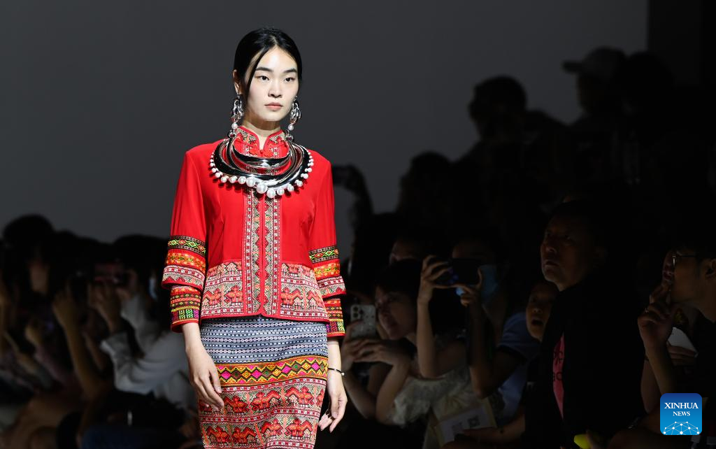 Models present creations during the fashion week at the third China International Consumer Products Expo (CICPE) in Haikou, capital city of south China's Hainan Province, on April 14, 2023. The fashion week, scheduled from April 10 to 15, concluded on Saturday in Haikou. (Xinhua/Yang Guanyu)