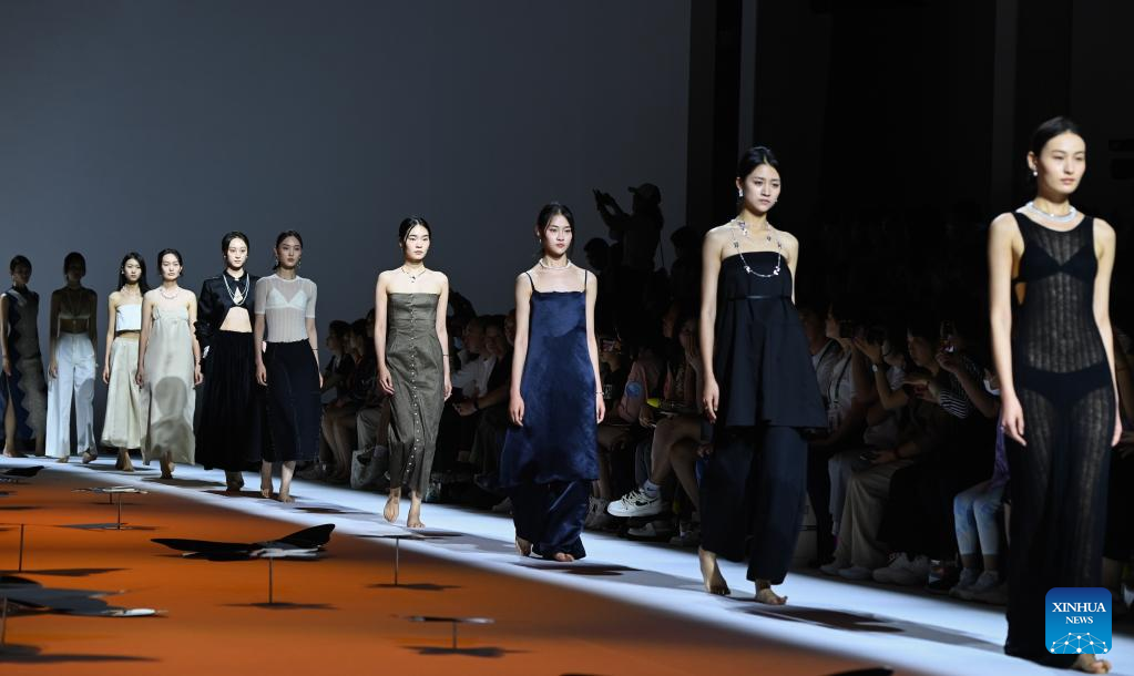 Models present creations during the fashion week at the third China International Consumer Products Expo (CICPE) in Haikou, capital city of south China's Hainan Province, on April 11, 2023. The fashion week, scheduled from April 10 to 15, concluded on Saturday in Haikou. (Xinhua/Pu Xiaoxu)