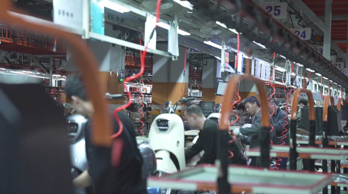 Photo taken in March, 2023 shows one of the production lines of Yadea, a global leader in developing and manufacturing electric two-wheel vehicles. (Photo: Peng Yukai/People's Daily Online)
