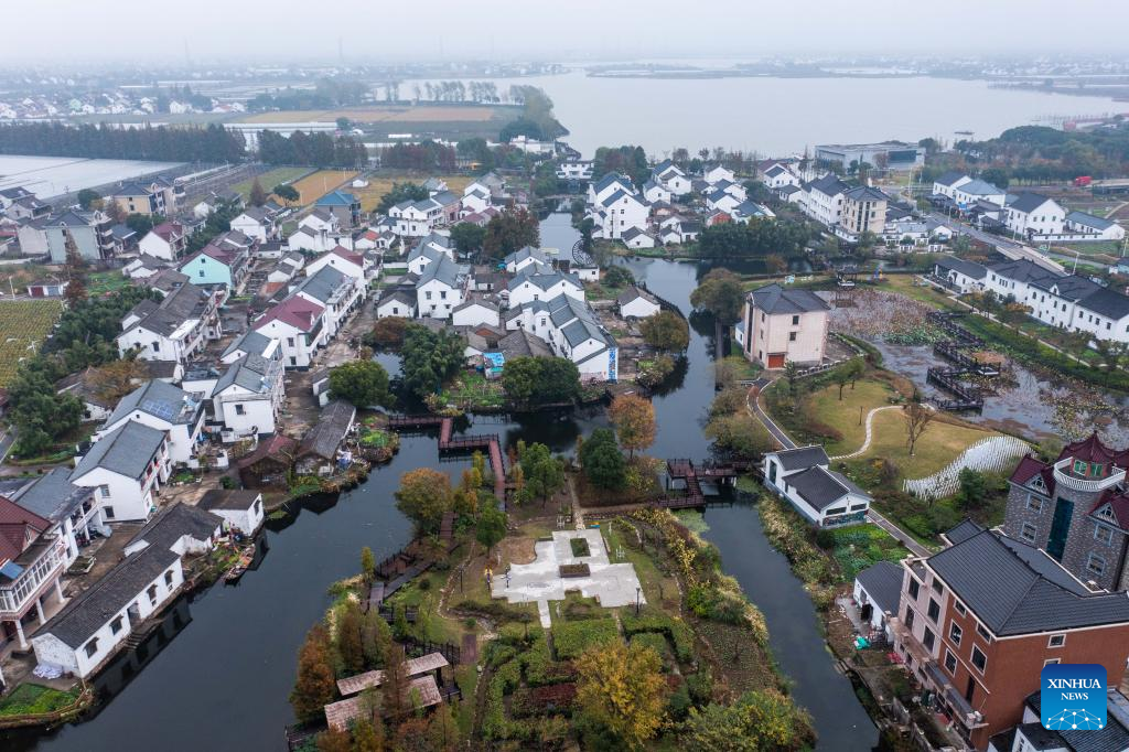 This aerial photo taken on Nov. 22, 2022 shows the Linglongwan in Shengfeng Village of Xiuzhou District of Jiaxing City, east China's Zhejiang Province. China has inscribed a total of 8,155 traditional villages to its state protection list in an effort to conserve the country's millennia-old agricultural civilization, official data showed. Zhejiang is among the leaders in the country's rural vitalization drive, with great efforts being made to protect the natural environment and traditional culture. (Xinhua/Xu Yu)