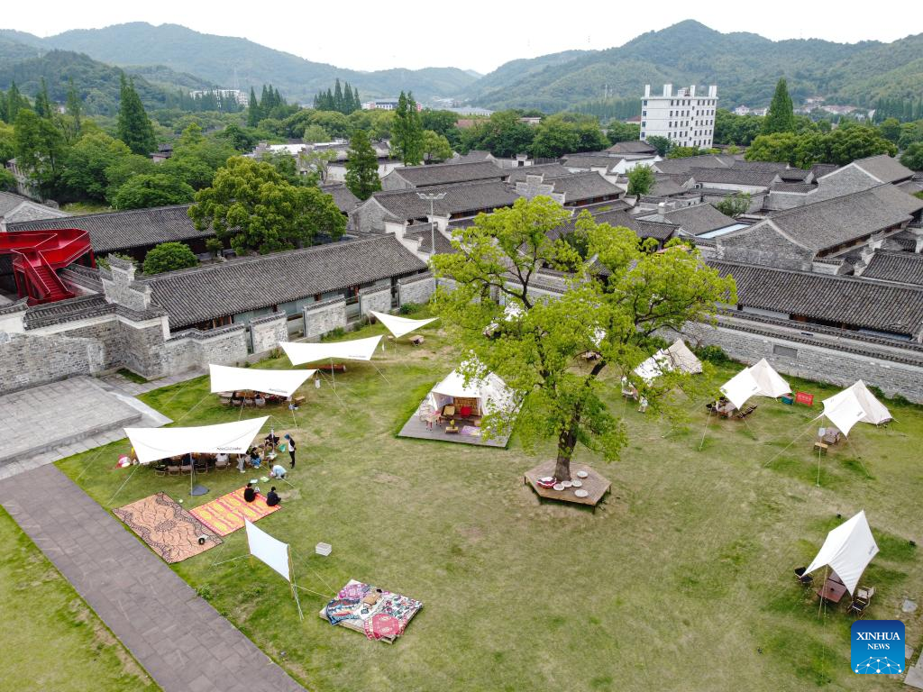 This aerial photo taken on May 19, 2022 shows a camping site in Cicheng Town of Jiangbei District of Ningbo City, east China's Zhejiang Province. China has inscribed a total of 8,155 traditional villages to its state protection list in an effort to conserve the country's millennia-old agricultural civilization, official data showed. Zhejiang is among the leaders in the country's rural vitalization drive, with great efforts being made to protect the natural environment and traditional culture. (Xinhua/Jiang Han)