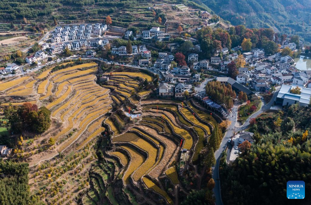 This aerial photo taken on Nov. 5, 2022 shows the autumn scenery of Zhinan Village in Lin'an District of Hangzhou City, east China's Zhejiang Province. China has inscribed a total of 8,155 traditional villages to its state protection list in an effort to conserve the country's millennia-old agricultural civilization, official data showed. Zhejiang is among the leaders in the country's rural vitalization drive, with great efforts being made to protect the natural environment and traditional culture. (Xinhua/Xu Yu)