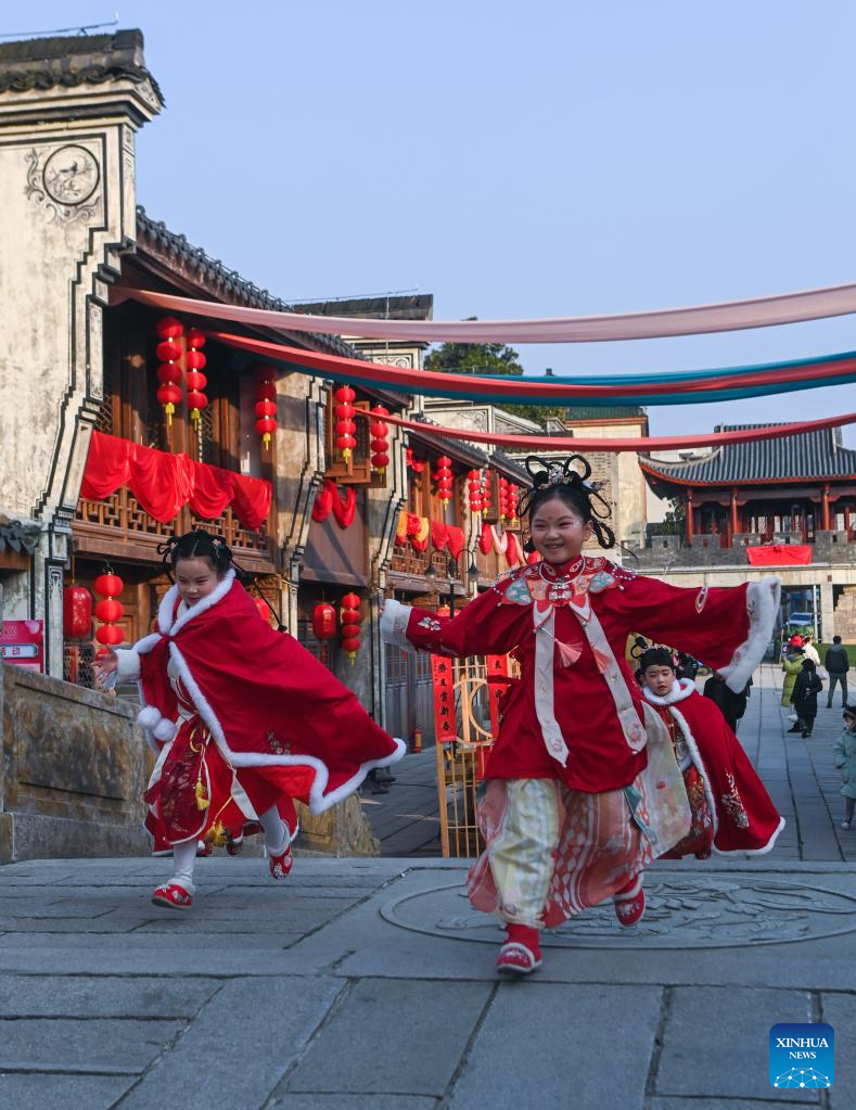 Children have fun at a cultural block in Xindeng Town of Fuyang District of Hangzhou City, east China's Zhejiang Province, Jan. 26, 2023. China has inscribed a total of 8,155 traditional villages to its state protection list in an effort to conserve the country's millennia-old agricultural civilization, official data showed. Zhejiang is among the leaders in the country's rural vitalization drive, with great efforts being made to protect the natural environment and traditional culture. (Xinhua/Xu Yu)