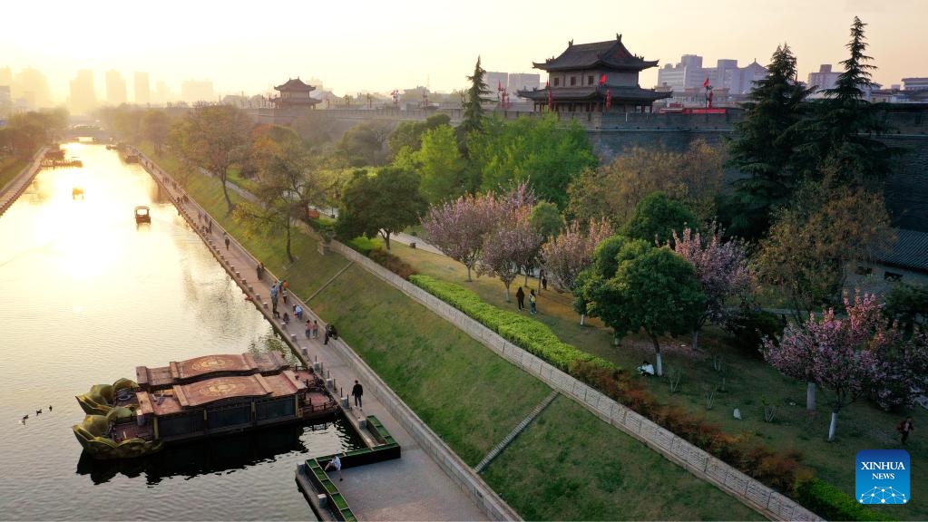 This aerial photo taken on April 15, 2023 shows a view of a scenic moat area along the ancient city wall in Xi'an, northwest China's Shaanxi Province. (Xinhua/Liu Xiao)?