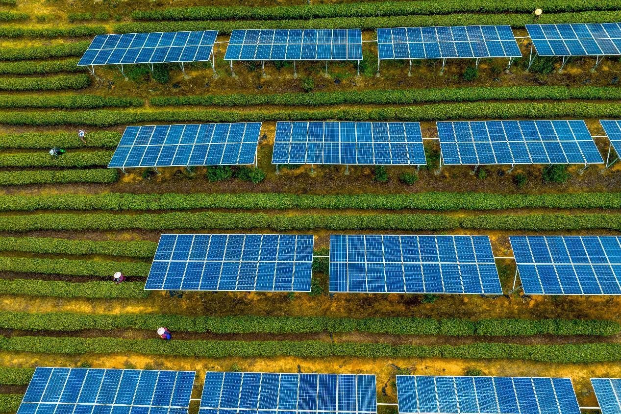 Farmers pick tea leaves in a tea plantation with photovoltaic panels in Sanjie township, Shengzhou, east China's Zhejiang province. (People's Daily Online/Pan Weifeng)