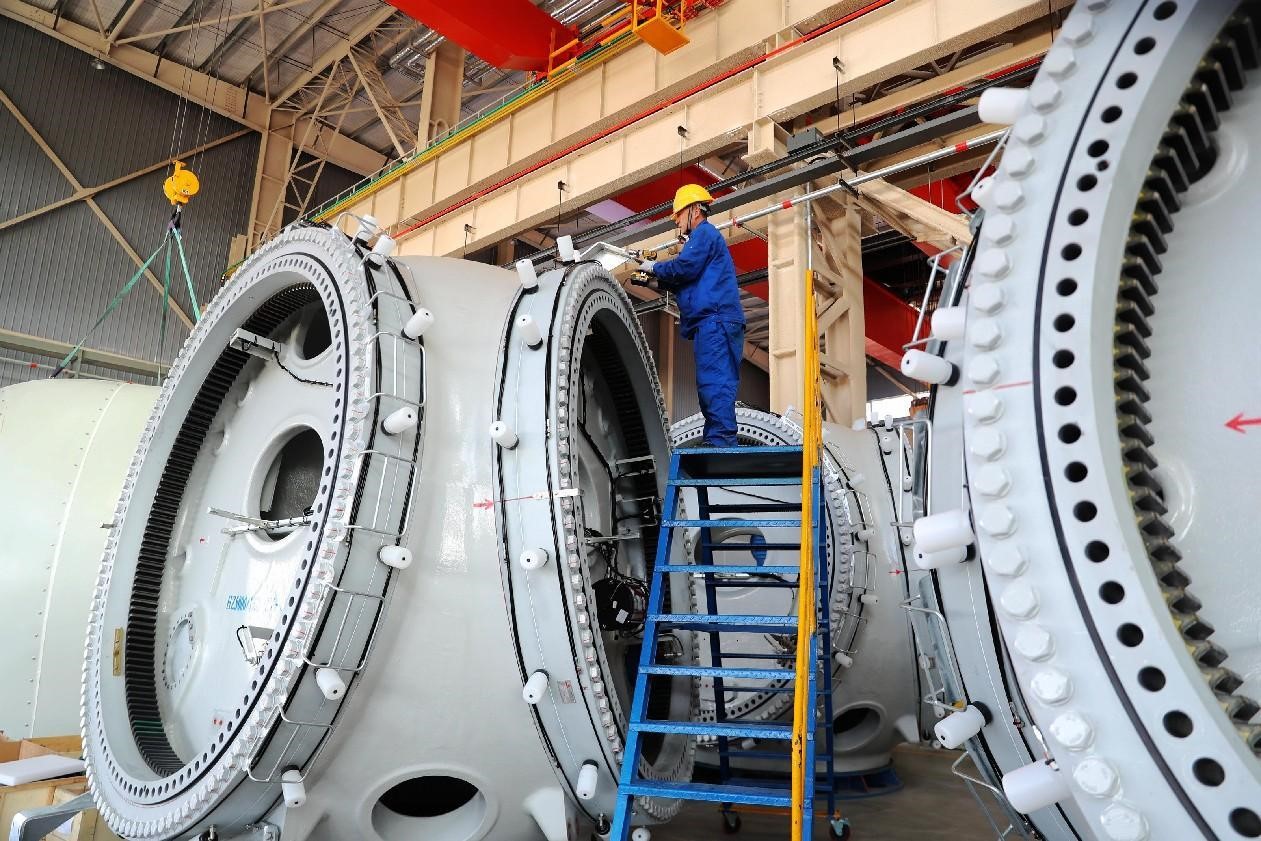 Parts of wind turbines are being assembled in a workshop of a new energy company in Zhangye, northwest China's Gansu province. (People's Daily Online/Cheng Lin)