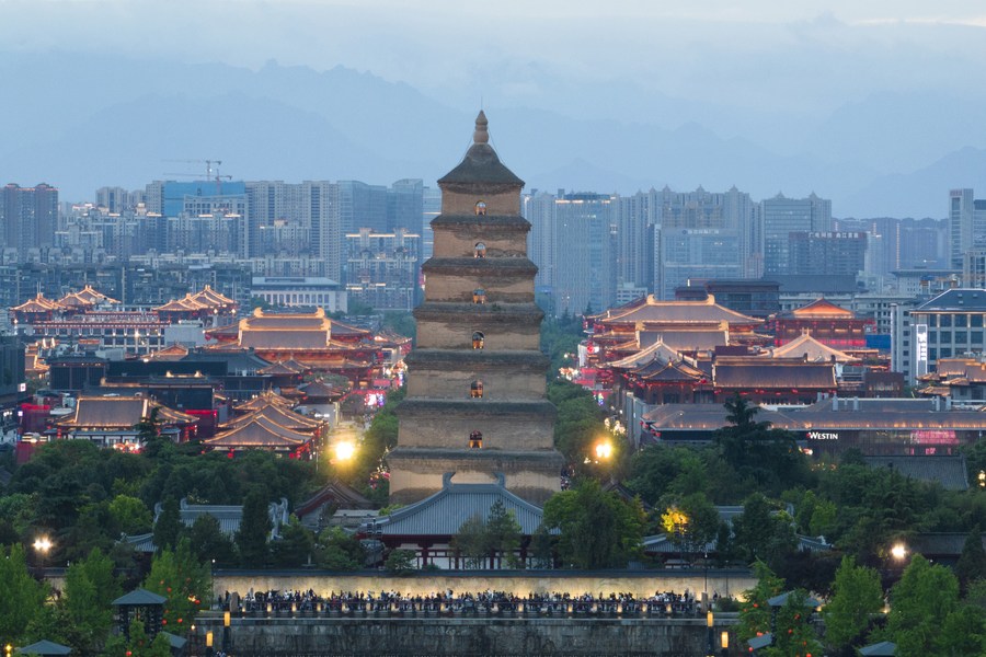 This photo taken on May 8, 2023 shows a view of the Giant Wild Goose Pagoda and the Datang Everbright City scenic area in Xi'an, northwest China's Shaanxi Province. (Xinhua/Shao Rui)