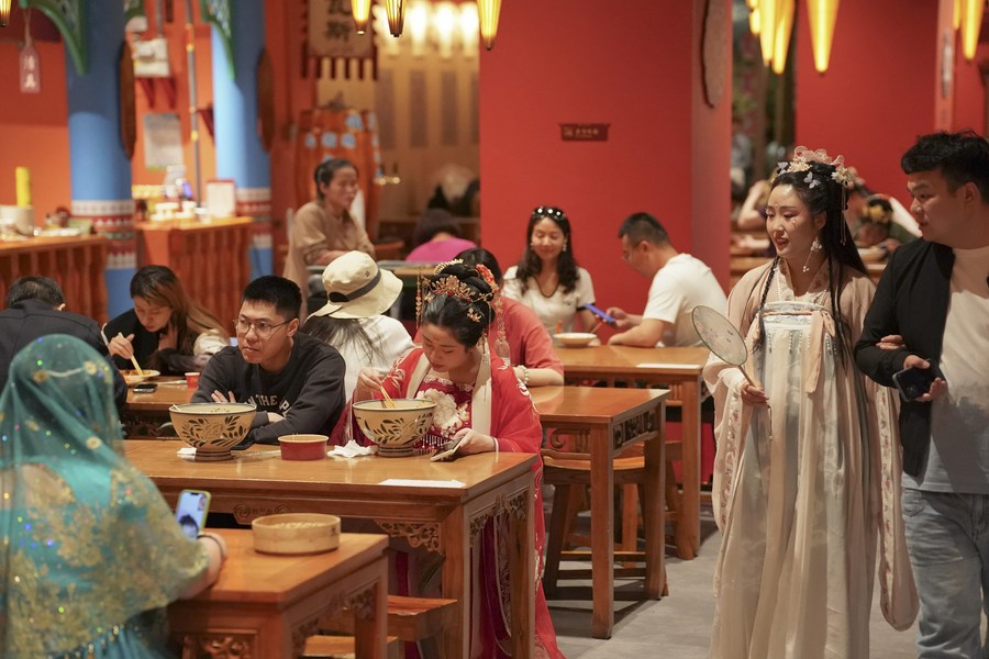 Tourists dine at a themed street in Xi'an, northwest China's Shaanxi Province, May 11, 2023. (Xinhua/Shao Rui)