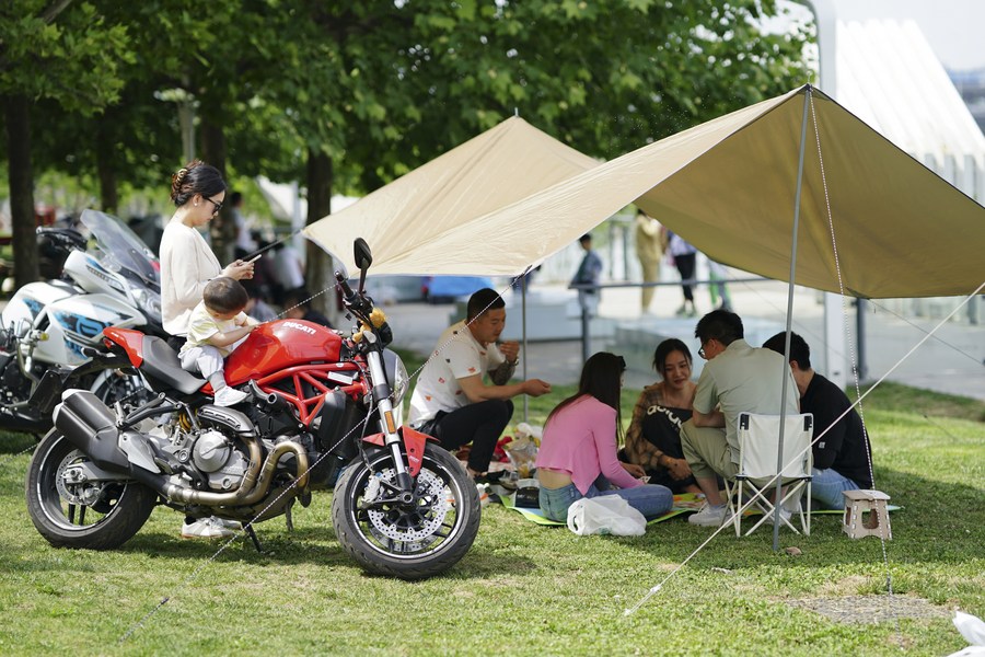 People camp at a park along the Bahe River in Xi'an, northwest China's Shaanxi Province, May 15, 2022. (Xinhua/Shao Rui)