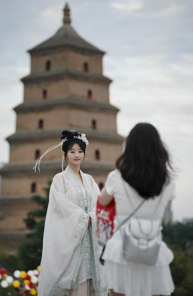 Tourists take photos near the Giant Wild Goose Pagoda in Xi'an, northwest China's Shaanxi Province, May 8, 2023. (Xinhua/Shao Rui)