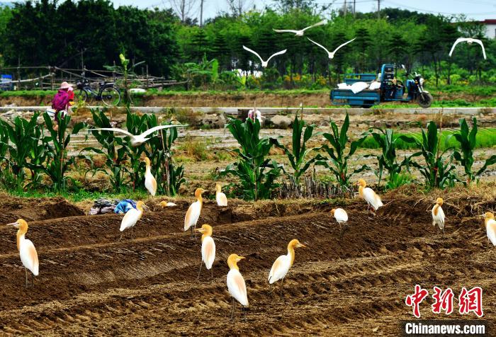 Egrets were seen playing and looking for food near farming machines which were working in fields in Tantou township, Changle district, Fuzhou city, southeast China's Fujian Province, on May 11. Egrets are regular visitors of Fuzhou as the local ecological environment has continuously improved in recent years.